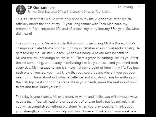 CP Gurnani, former CEO and Managing Director of Tech Mahindra, bid adieu after completing 19 years at the company. As he’retired’ from his business life, Gurnani issued a goodbye message on LinkedIn. In the letter, he shared valuable learnings from his remarkable career.