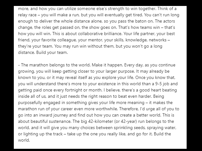 Gurnani went on to discuss the importance of teamwork. He said, “You will nearly always need a team in life and at work. It’s unlikely that you will make significant progress by yourself, but you will either lead one, participate in one, or both. Consider how your strengths can help you win when you play together. But consider your areas of weakness further, and consider how you may work with others’ strengths to succeed as a team. Consider a relay race: you will run, but you will tire out soon. You hand the baton to someone else since you are unable to run the entire distance on your own. The show continues even after the actors swap roles.